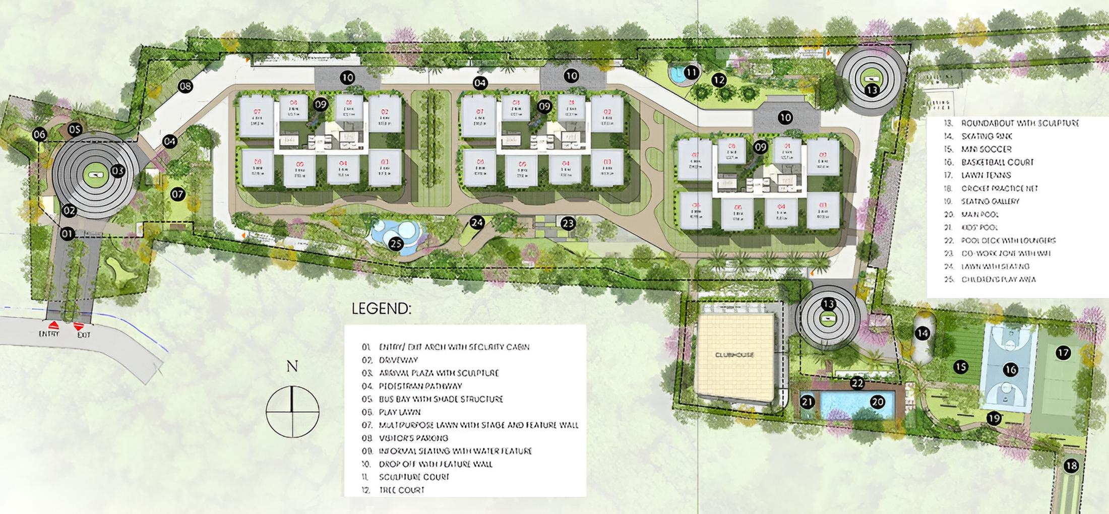 Amenities include a large clubhouse, swimming pool, gym, sports courts, yoga/meditation deck, children’s play area, landscaped gardens, banquet hall, EV charging, and 24/7 security.